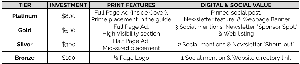 Strategic Lead Generation: Utilize our digital platforms (social, web, email) to drive traffic directly to your business through high-value placements and mentions (see table below).