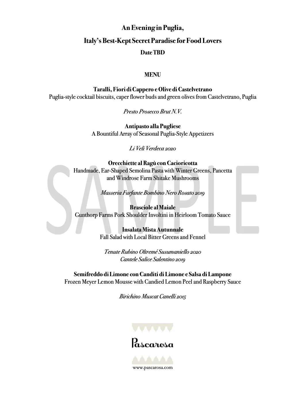 Chef Catherine Faris of Pascarosa will prepare an authentic, Italian culinary feast featuring the cuisine of Italy’s southern Adriatic coast. Composed of organic, local and seasonal ingredients, Pascarosa’s organic extra virgin olive oil, and hard-to-find Italian specialties provided by Antonuccio’s Italian Market, the four-course dinner is planned for eight (8) guests at your home, or the home of Dr. Andrew and Janet Katz. This special dinner will be paired with Italian wines provided by Antonuccio’s. Final menu will be developed with the successful auction item bidder.